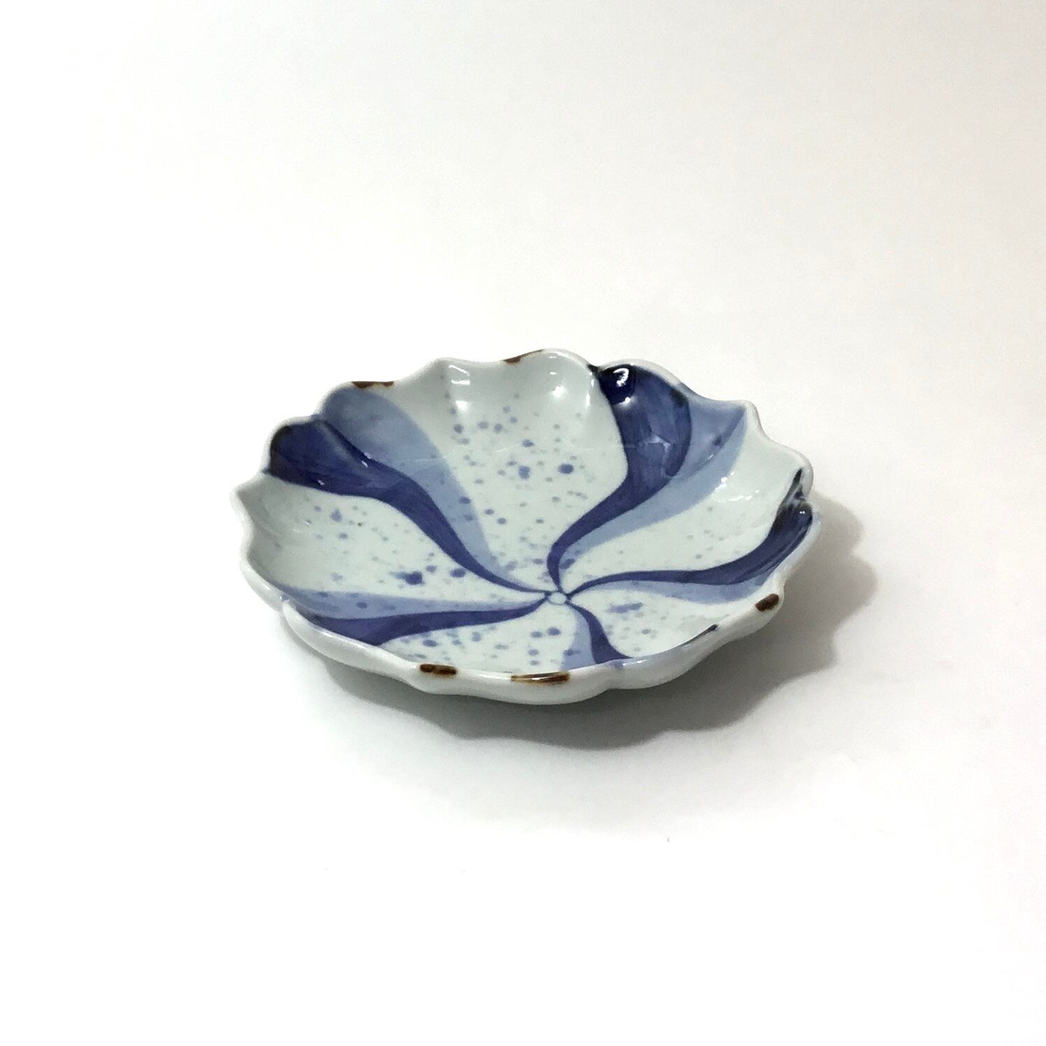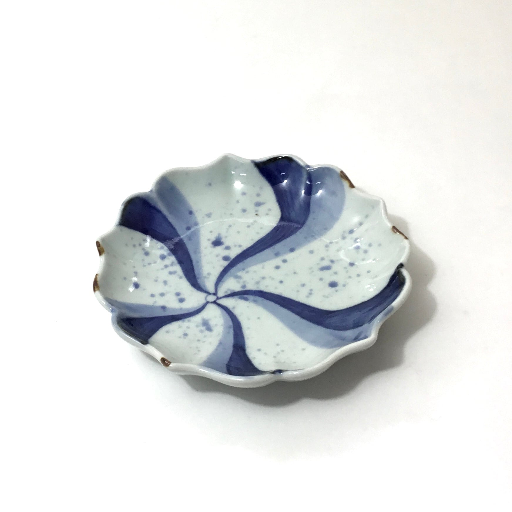 少し重心をずらして描いた流水が動きを感じさせこの大きさの皿を大きく見せています。花形の皿をリンカ皿といいます。取皿としても良い大きさです。