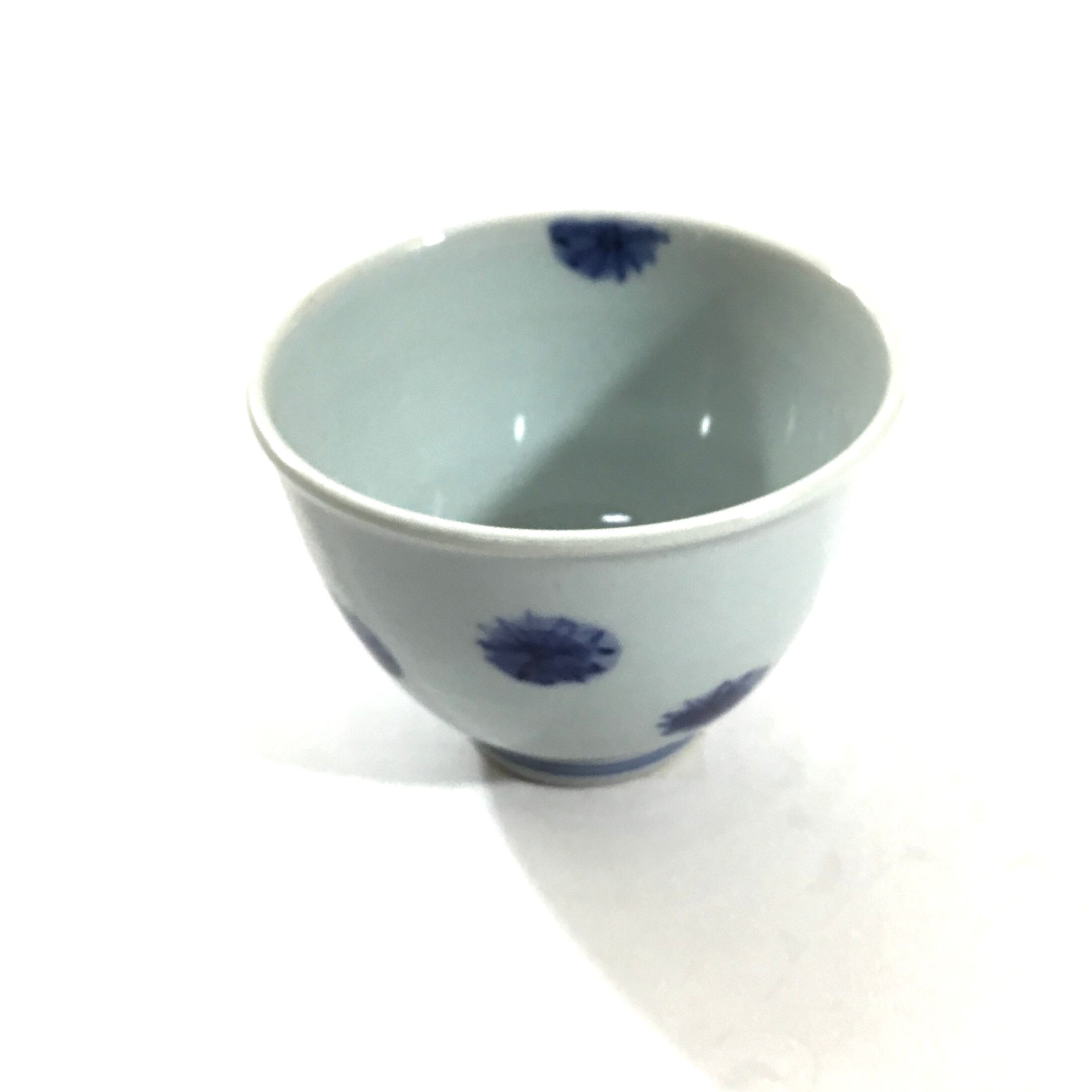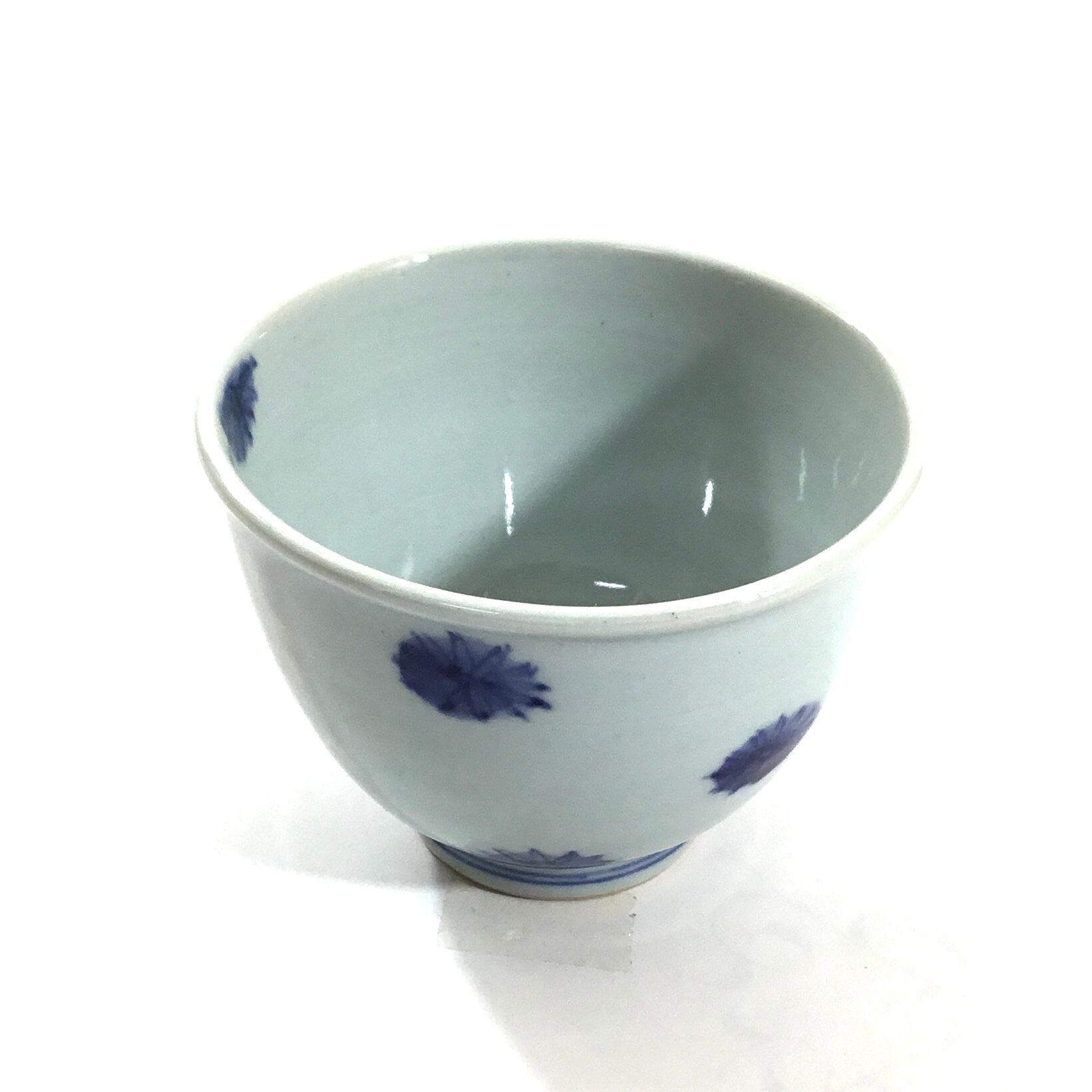 ロクロで手作りした少し大きめの仙茶碗です。8分目注いで160cc入ります。菊の花を小紋に見立てたデザインです。