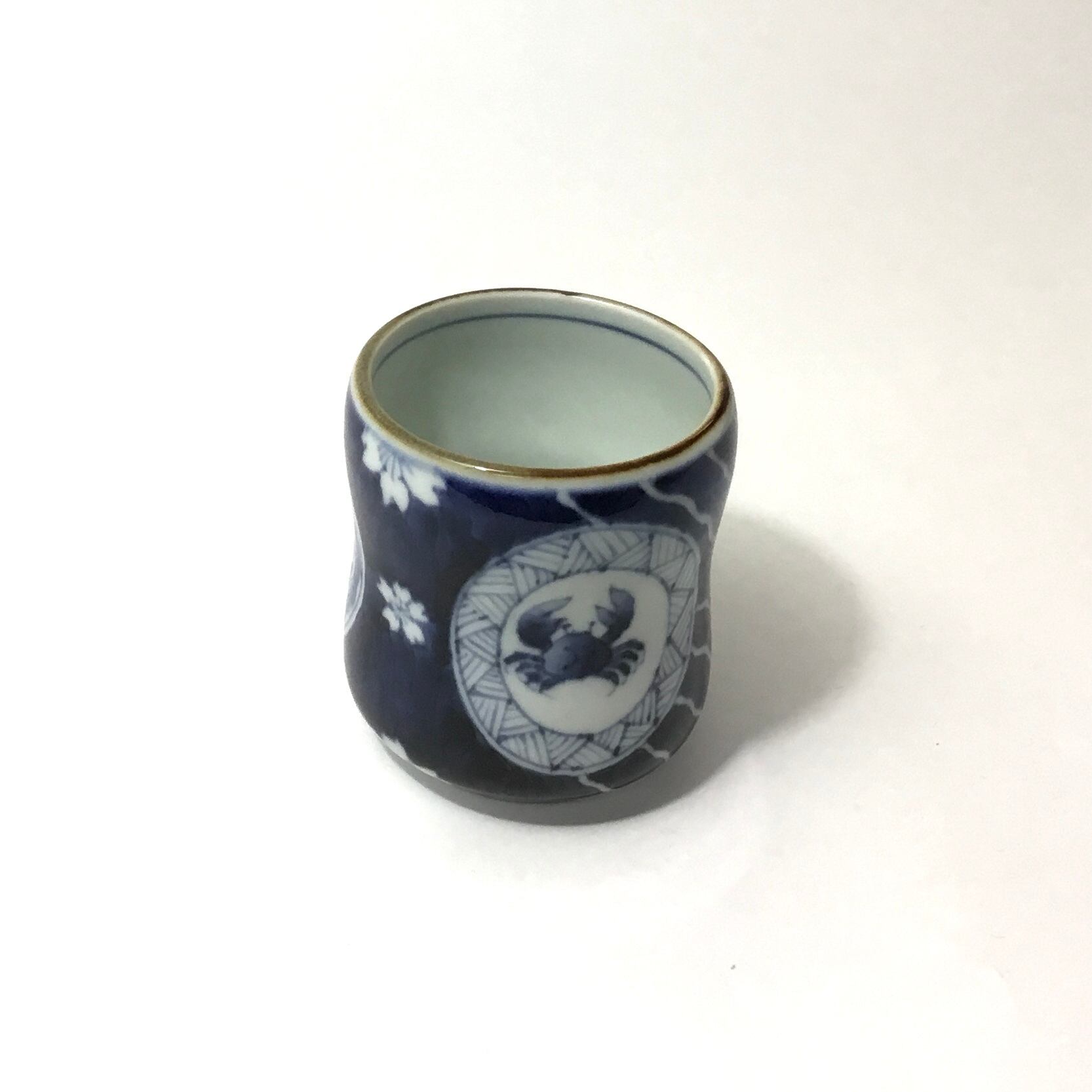 丸に囲まれた中に蟹、山水、地紋を描いてあり桜や水玉、流水などが描いてあります。真ん中の辺りがすぼんでいて持ち易い形状でタップリのお茶も楽しんでいただけます。